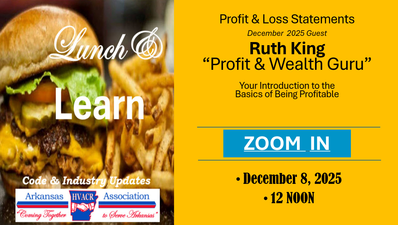 The first of its kind and may still be the only one. Lunch & Learn webinars are free to everyone on the 2nd Monday of each month at noon. They are a collaboration between the Arkansas Department of Labor and Licensing, HVACR Program and the Arkansas HVACR Association. The goal is to provide code updates and clarification for the HVACR industry. Since education is the cheapest and most effective form of regulation and inspection, we trust that these short, about 20 minute, sessions will prove valuable to the industry and ensure Arkansans safe, effective HVACR systems. So grab a burger and tune in. You’ll be glad you did. Archives follow. Just click on the graphic.